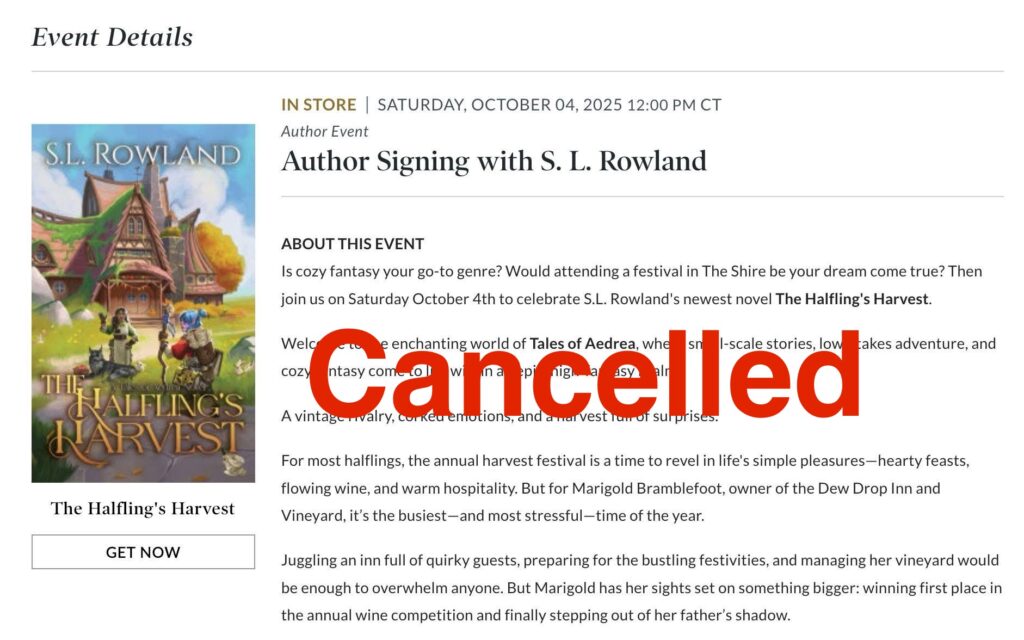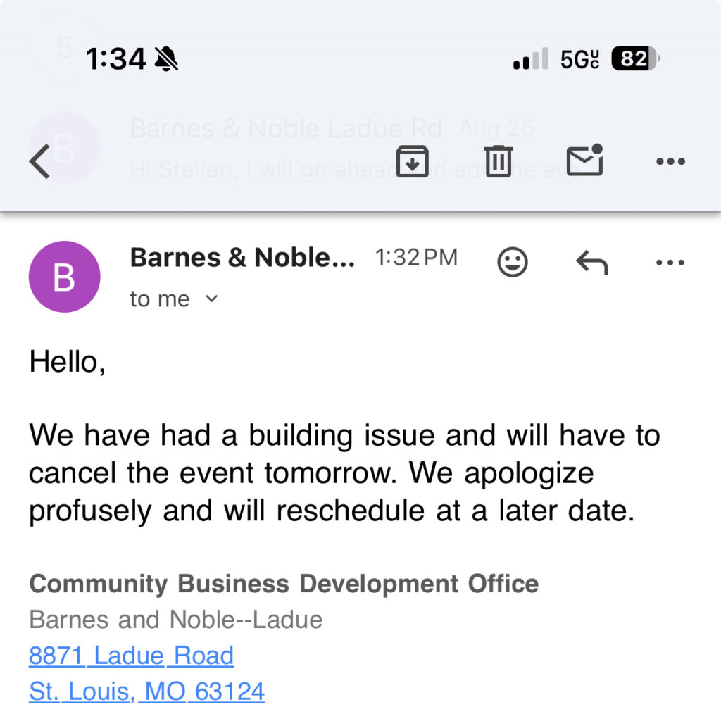 Sorry for the inconvenience, everyone, but I have been informed that there is an issue with the building at Barnes & Noble Ladue, so the event for today has been cancelled. Hopefully, we’ll be able to reschedule soon.