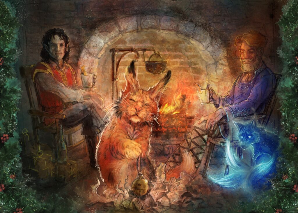Rhoren jingled the bell again, and Jinxed meowed loudly as he extended a paw to the elf’s hand. “Though I may live to regret it, I would be remiss if I didn’t include our two furry compatriots in tonight’s festivities. For our little menace, Jinx, I have a bell for him to play with.”